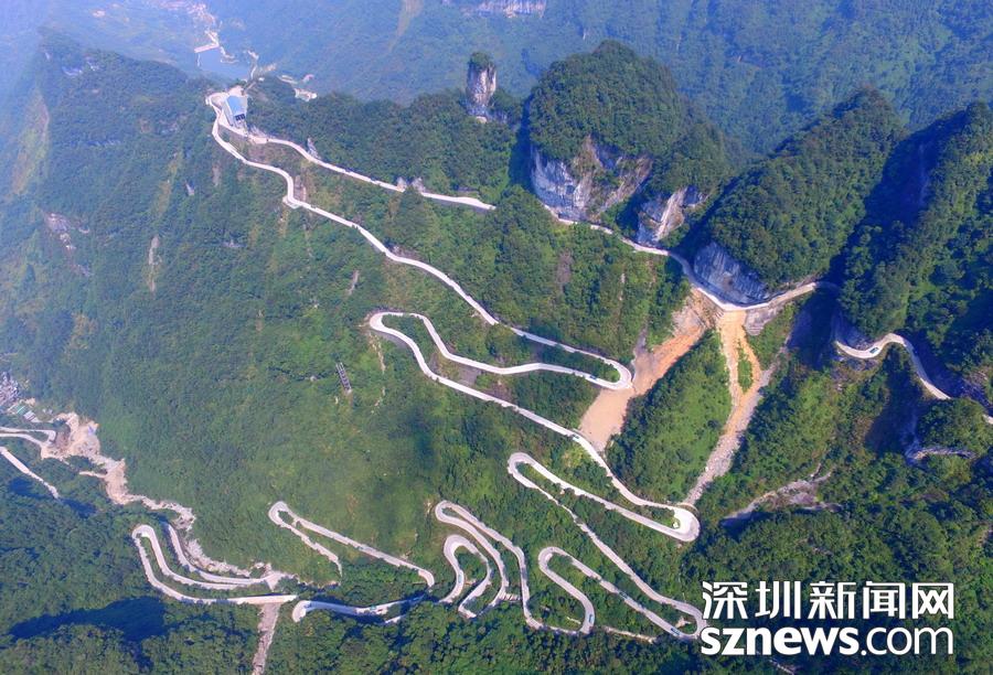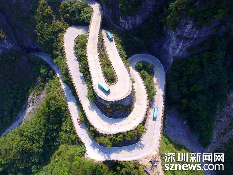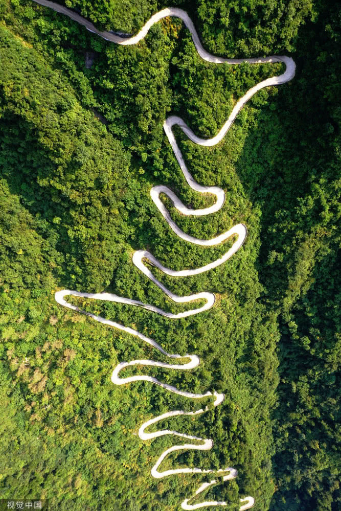 天門山盤山公路位于湖南省張家界市境內的國家森林公園天門山上,盤山公路全長10.77公里,海拔從200米急劇提升到1300米,大道兩側絕壁千仞,空谷幽深,共計99個彎,180度急彎此消彼長,似玉帶環(huán)繞,航拍鏡頭下蜿蜒曲折的道路彎彎緊連,層層迭起,宛如迷宮般的“納斯卡線條”,被譽為“天下第一公路奇觀”,同時它也是世界上最危險的十大公路之一。