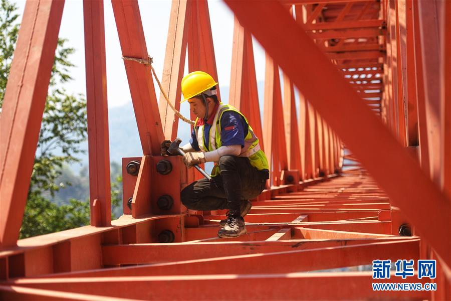 在位于普洱市的木乃河雙線特大橋工程現(xiàn)場(chǎng),工人鐘琪在檢查螺絲緊固情況(4月12日攝)。新華社記者秦晴攝