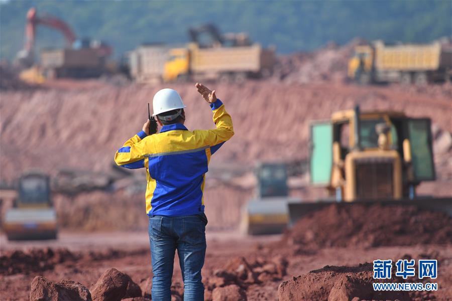 普洱車站施工現(xiàn)場,中鐵八局的工人在指揮壓路機碾壓路面(4月12日攝)。新華社記者秦晴攝