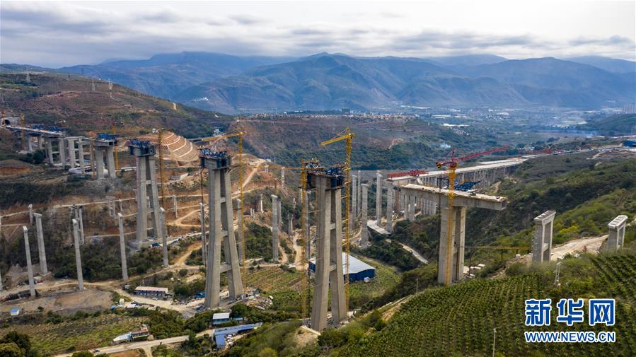 這是3月5日拍攝的中老鐵路南溪河特大橋橫跨在建高速公路(無人機(jī)照片)。新華社記者江文耀攝