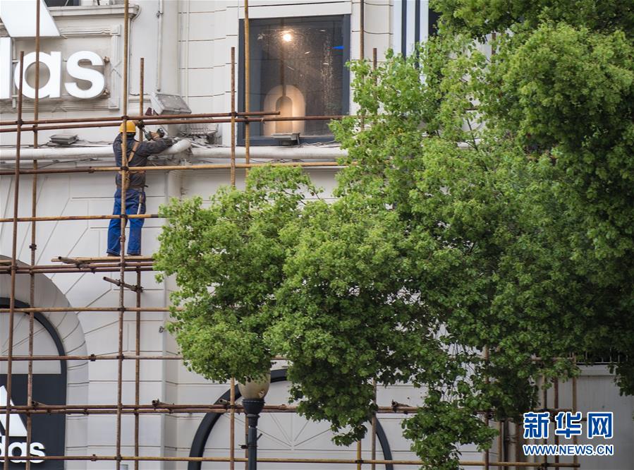 4月8日,在江漢路步行街,工人在施工。新華社記者肖藝九攝
