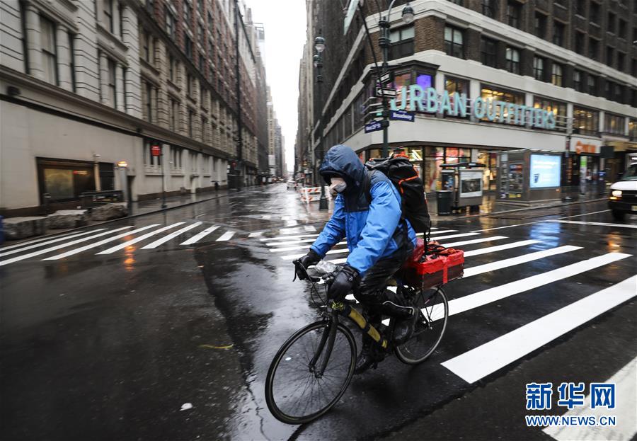 3月23日,一名外賣送貨員戴口罩騎行在美國(guó)紐約街頭。新華社記者王迎攝
