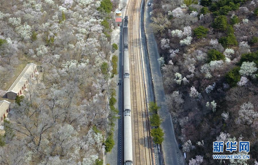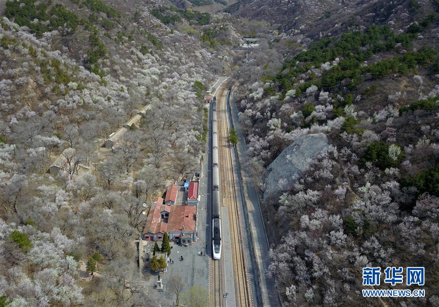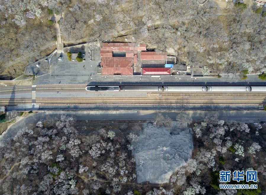 4月8日,北京青龍橋火車站附近春花盛開(無人機照片)。 當日,北京青龍橋火車站附近,春花綻放,為這座百年火車站增添濃濃春意。   新華社記者張晨霖攝