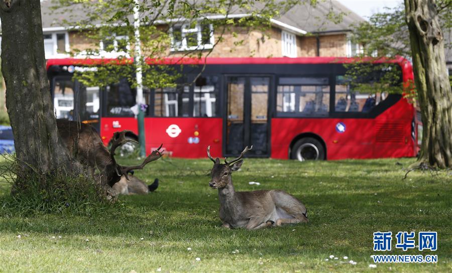 4月8日,在英國倫敦東部一個居民區(qū),附近公園里的鹿在草坪上休息。隨著新冠疫情在英國的擴(kuò)散,政府要求人們減少不必要的外出。倫敦東部一個居民區(qū)附近公園里原來散養(yǎng)的鹿紛紛從公園走出來,或吃草或接受附近居民的喂食,成為特殊時期居民區(qū)里的新“客人”。新華社記者韓巖攝