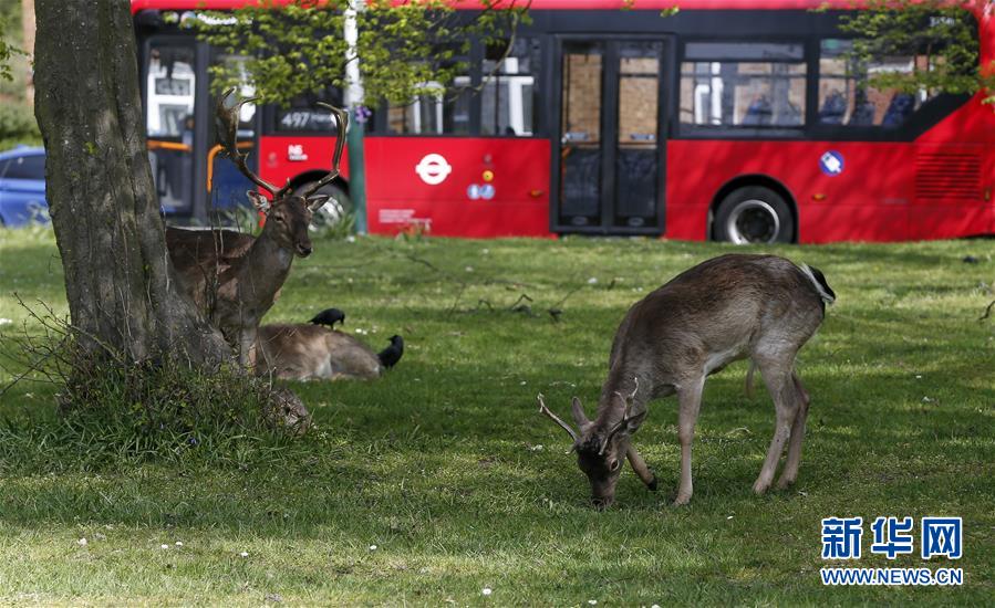 4月8日,在英國倫敦東部一個居民區(qū),附近公園里的鹿在草坪上吃草。隨著新冠疫情在英國的擴(kuò)散,政府要求人們減少不必要的外出。倫敦東部一個居民區(qū)附近公園里原來散養(yǎng)的鹿紛紛從公園走出來,或吃草或接受附近居民的喂食,成為特殊時期居民區(qū)里的新“客人”。新華社記者韓巖攝
