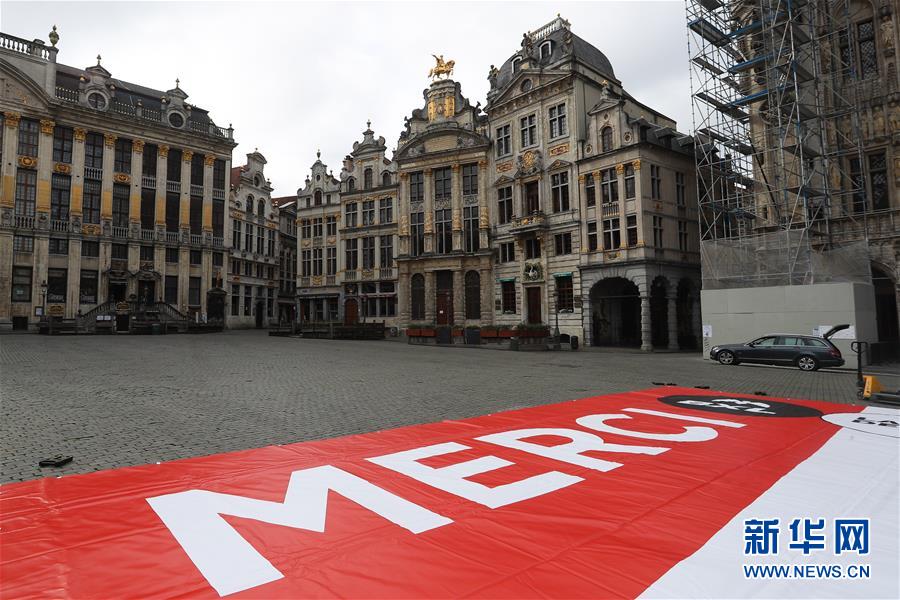 這是4月13日在比利時布魯塞爾大廣場拍攝的為抗擊疫情加油的巨幅海報。當日,比利時布魯塞爾市政府工作人員在市中心的大廣場展開一面巨幅海報,上面用法語和荷蘭語印著“一起鼓起勇氣”“謝謝”,以感謝市民及醫(yī)療人員為抗擊疫情所做的努力。新華社記者鄭煥松攝