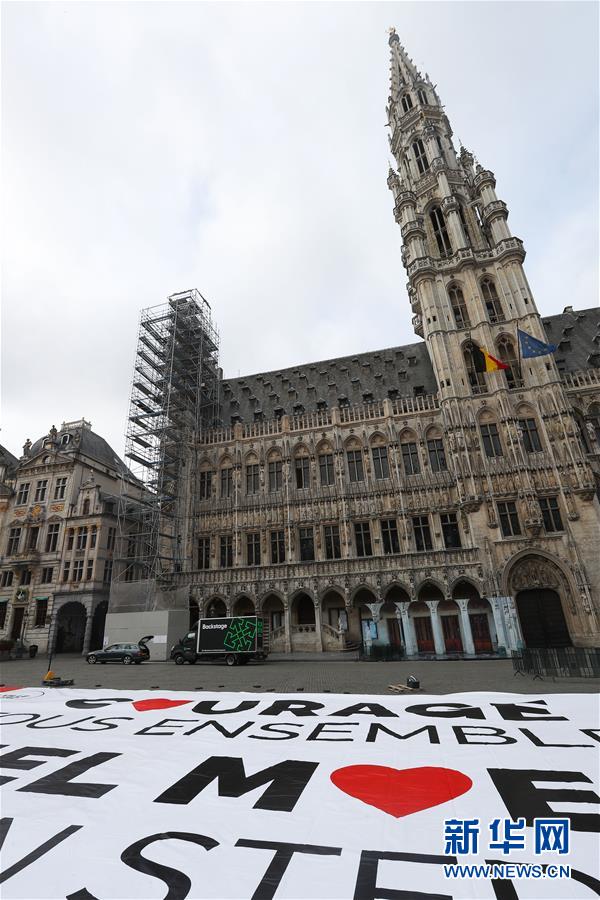 比利時布魯塞爾巨幅海報為抗擊疫情加油