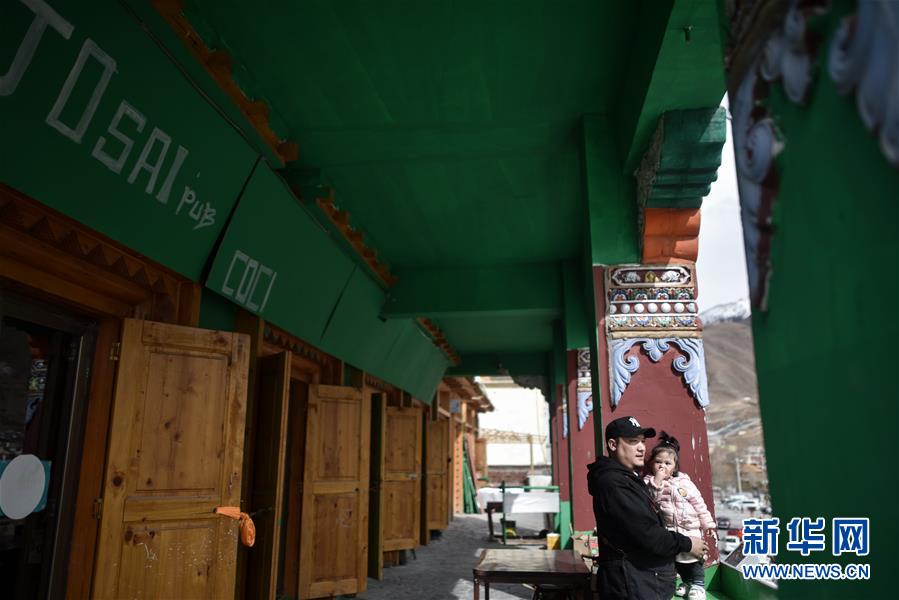 4月10日,才仁俄賽和女兒在餐廳門口。新華社記者張宏祥攝