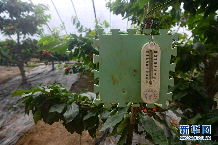 這是4月15日在特克斯礪劍鋒農林科技有限公司赤谷新城休閑觀光農業(yè)示范園拍攝的反季節(jié)大櫻桃大棚內的溫濕度計。大棚采用自動控制通風裝置,保持棚內溫度濕度穩(wěn)定。近日,新疆伊犁哈薩克自治州特克斯縣的反季節(jié)大櫻桃陸續(xù)上市。傳統(tǒng)大田櫻桃的集中成熟期在6月底至7月初,采用溫室大棚種植櫻桃可將成熟期提前到3月底至4月初,填補了市場空檔期。特克斯礪劍鋒農林科技有限公司目前種植反季節(jié)大櫻桃共有19棚,櫻桃每公斤售價達200元。新華社記者宋彥樺攝