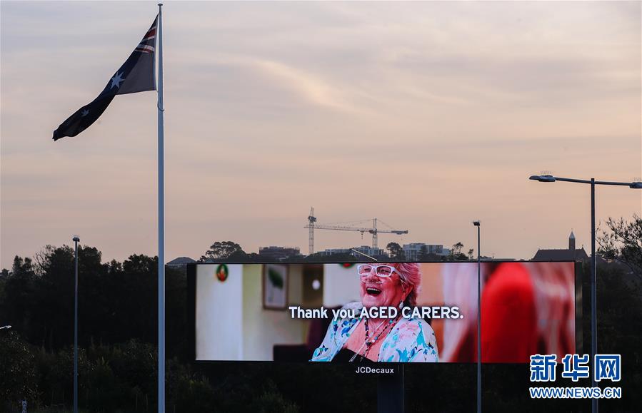 4月15日,在澳大利亞悉尼,戶外廣告牌上打出“感謝老年護理工作者”的字樣,感謝在疫情期間工作的人們。新華社記者白雪飛攝