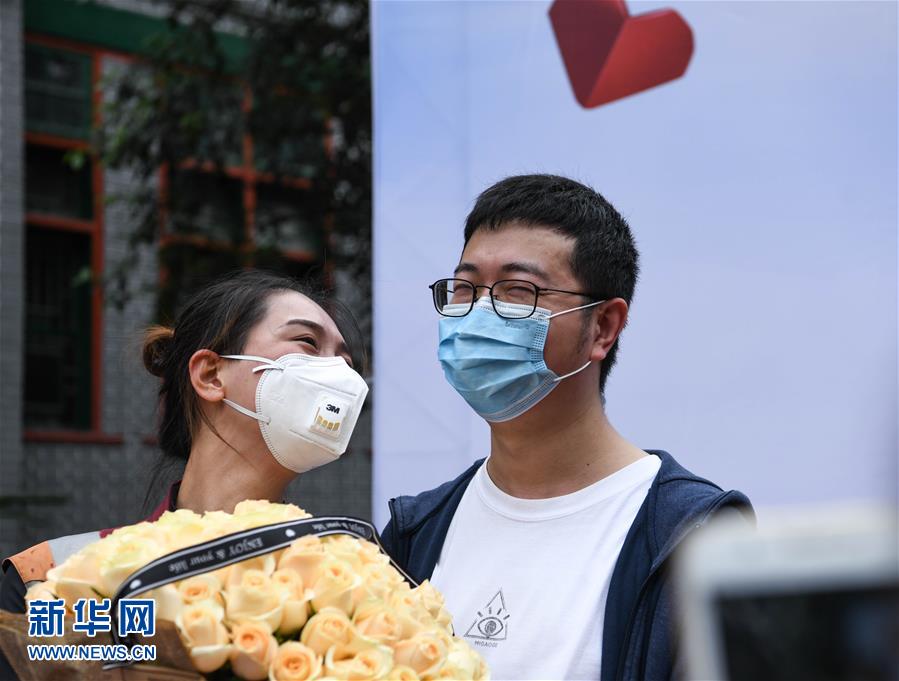4月21日,在四川大學(xué)華西醫(yī)院,醫(yī)療隊(duì)隊(duì)員接受男友的捧花。當(dāng)日,來(lái)自四川大學(xué)華西醫(yī)院、華西第二醫(yī)院、華西第四醫(yī)院的醫(yī)療隊(duì)隊(duì)員解除隔離休整,與分別許久的家人、同事團(tuán)聚,緊緊相擁。新華社記者王曦?cái)z