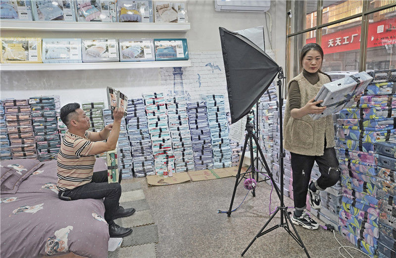 2019年11月11日,浙江金華,義烏北下朱村,一名男子在直播。一名女子在購物。