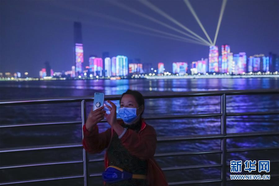 4月22日,市民乘坐武漢長(zhǎng)江客運(yùn)輪渡出行時(shí),在船上拍攝夜景。為建立與經(jīng)濟(jì)社會(huì)發(fā)展和疫情防控需要相適應(yīng)的運(yùn)輸服務(wù)保障機(jī)制,保障市民出行需求,從4月22日起,武漢城市公共交通有序恢復(fù)全線網(wǎng)運(yùn)營(yíng)。新華社記者沈伯韓攝