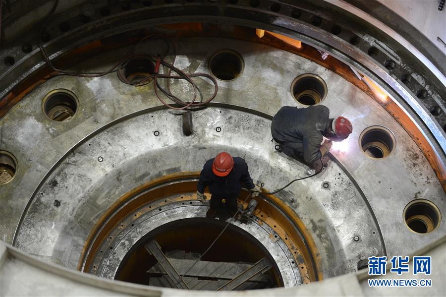 4月24日,一名工人在施工現(xiàn)場安裝機組轉子磁極引線和阻尼環(huán)。新華社記者韓曉雨攝