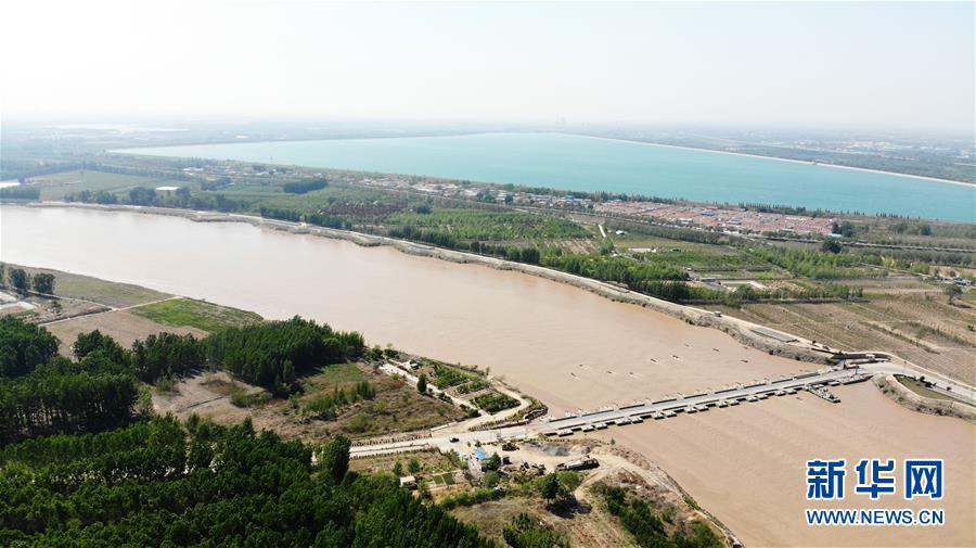 4月24日在山東濟南拍攝的黃河景色(無人機照片)。春暖花開的時節(jié),濟南黃河兩岸春風送綠,大河、綠植與城市構(gòu)成了一幅春的畫卷。新華社記者王凱攝