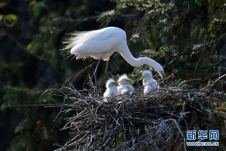 在象山森林公園,白鷺和幼鳥(niǎo)在一起(4月26日攝)。近日,在江西省南昌市新建區(qū)象山森林公園內(nèi),已安家筑巢的大批鷺鳥(niǎo)正陸續(xù)孵化后代,一派生機(jī)勃勃的景象。新華社記者彭昭之?dāng)z