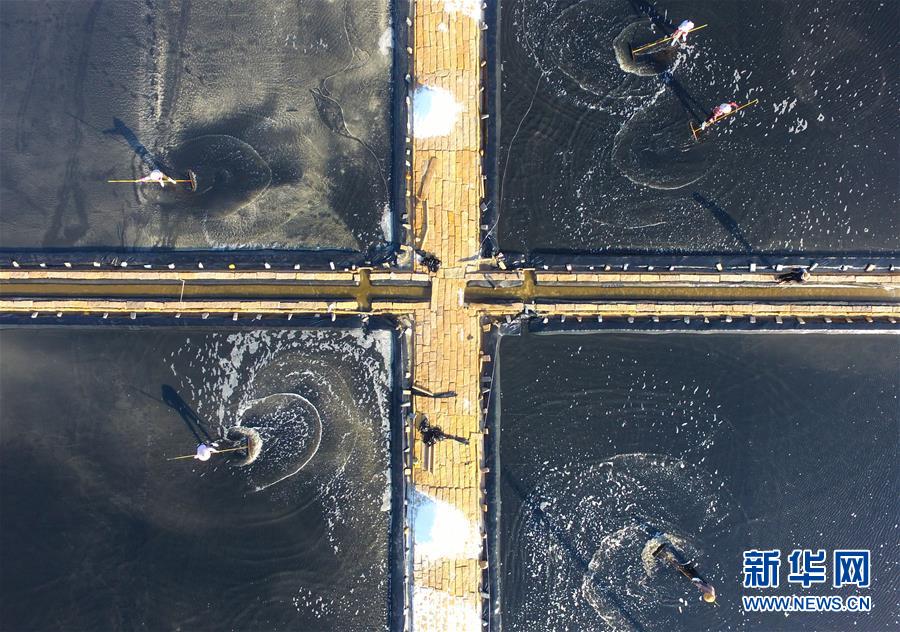 4月27日,莆田鹽場的工人在曬鹽池里忙碌(無人機照片)。莆田鹽場位于福建省莆田市秀嶼區(qū)東嶠鎮(zhèn),辛勤勞作的鹽工、縱橫交錯的曬鹽池,共同構(gòu)成如畫的風景。新華社記者魏培全攝