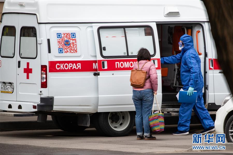 4月27日,在俄羅斯首都莫斯科,醫(yī)護(hù)人員(右)引導(dǎo)一名女子走上救護(hù)車(chē)。據(jù)俄羅斯防疫指揮部27日消息,過(guò)去24小時(shí)俄新增新冠肺炎確診病例6198例,累計(jì)確診87147例,單日增幅7.66%。新華社記者白雪騏攝