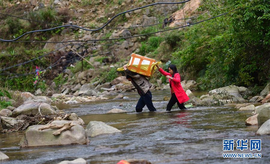 3月25日,在桂黔烏英苗寨,村民將螺苗搬往田間,準(zhǔn)備投放。新華社記者黃孝邦攝