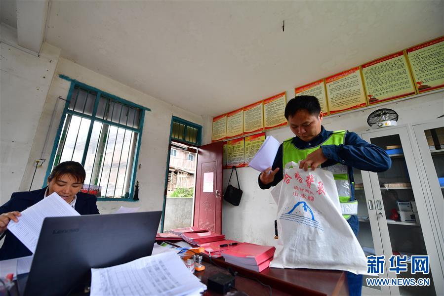 李義成(右)在辦公室拿上扶貧材料,準(zhǔn)備走訪貧困戶(4月20日攝)。新華社記者黃孝邦攝