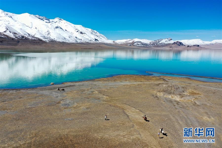 4月30日,牧民在當穹錯湖畔騎馬(無人機照片)。當穹錯地處西藏那曲市尼瑪縣南部,湖面海拔4475米。暮春時節(jié),湖水碧藍清亮,讓人仿佛置身仙境。新華社記者侯捷攝