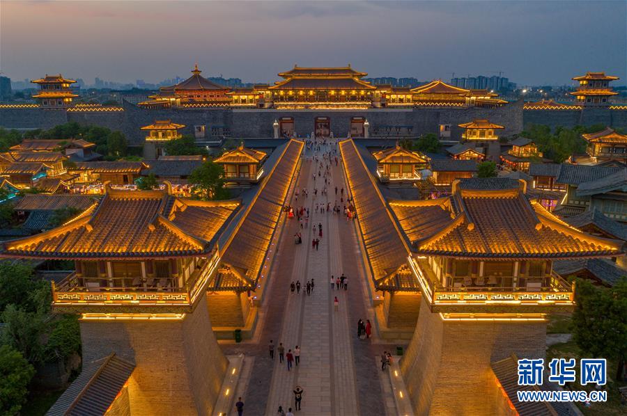 5月1日,游客在湖北省襄陽市唐城景區(qū)觀賞夜景(無人機(jī)照片)?!拔逡弧奔偃掌陂g,人們以多種方式放松心情、享受假日。新華社發(fā)(楊東攝)