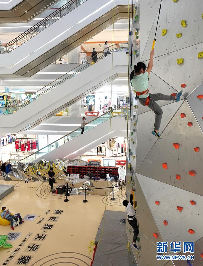 5月2日,小朋友在上海市南京路的一家百貨商場內(nèi)體驗(yàn)攀巖運(yùn)動?!拔逡弧奔偃掌陂g,人們以多種方式放松心情、享受假日。新華社記者陳飛攝