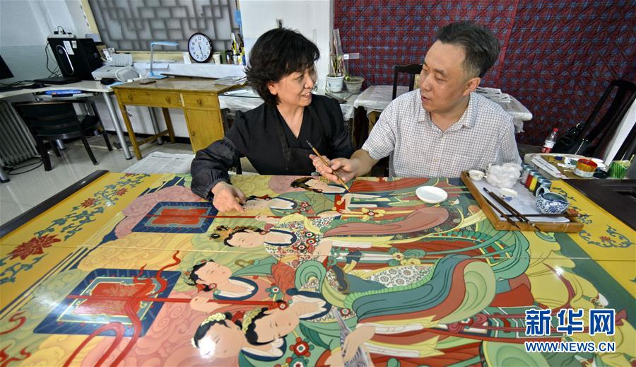 5月4日,屏風(fēng)設(shè)計人、國家級非物質(zhì)文化遺產(chǎn)“金漆鑲嵌髹飾技藝”代表性傳承人柏群(右)和領(lǐng)銜主創(chuàng)的工藝美術(shù)大師胡昕進(jìn)行屏風(fēng)畫面的最后檢視。新華社記者 李欣 攝