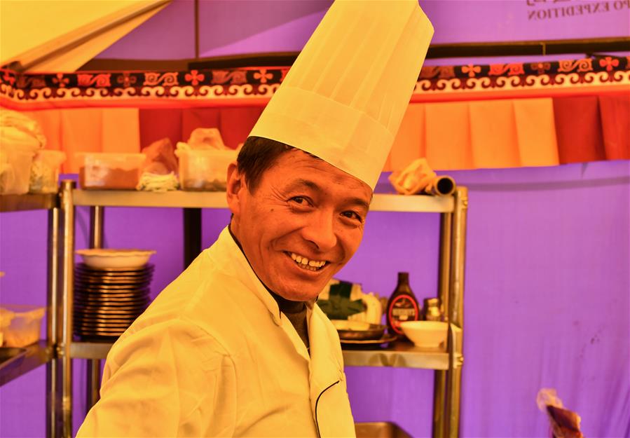高山廚師赤列在珠峰大本營(5月8日攝)。5月8日是世界微笑日。在海拔5200米的珠峰大本營,參與2020珠峰高程測量的各方人員,微笑期待本次測量活動(dòng)的圓滿成功。
