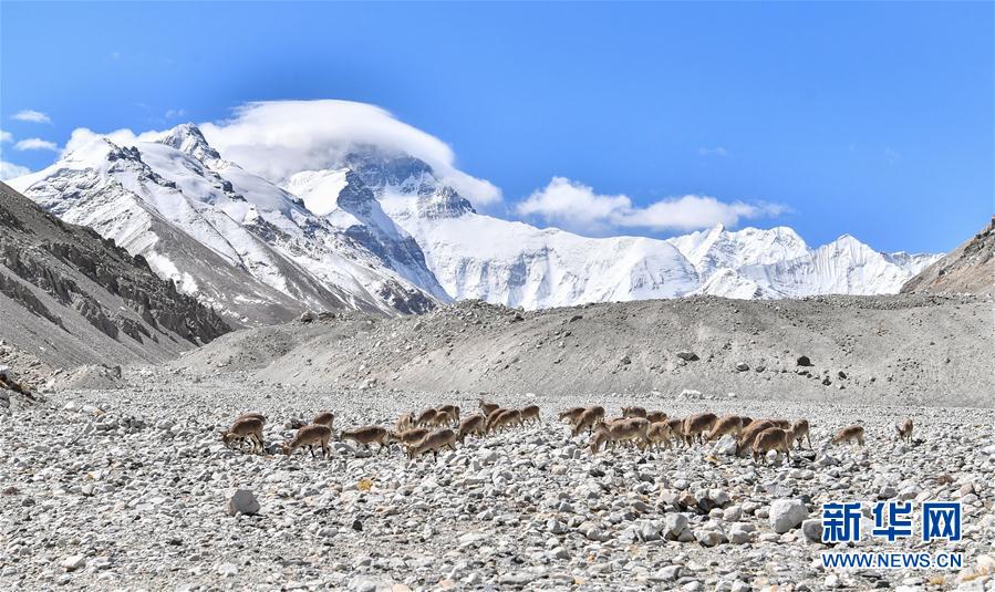 一群巖羊在珠峰大本營(yíng)附近覓食(5月8日攝)。當(dāng)日,一群巖羊在珠峰大本營(yíng)周圍覓食,黃嘴山鴉飛到巖羊身上停留,構(gòu)成一幅幅生動(dòng)有趣的雪域圖畫(huà)。新華社記者晉美多吉攝