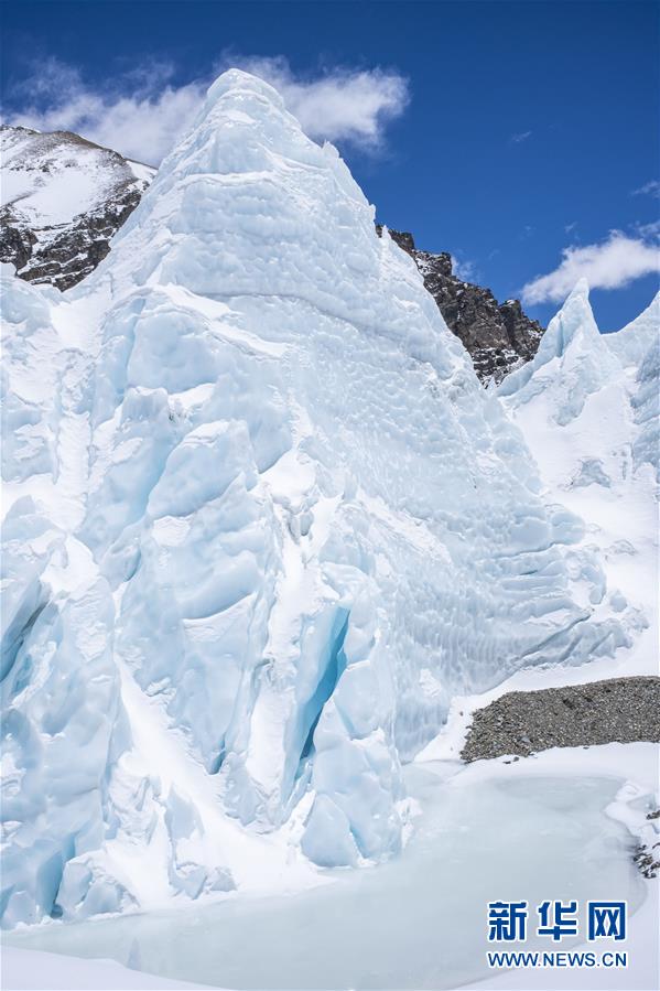 珠峰海拔5800米至海拔6500米的冰塔林(5月9日攝)。從海拔5800米的珠峰過渡營地到海拔6500米的前進(jìn)營地,冰塔林沿山谷排列,蔚為壯觀。新華社記者孫非攝
