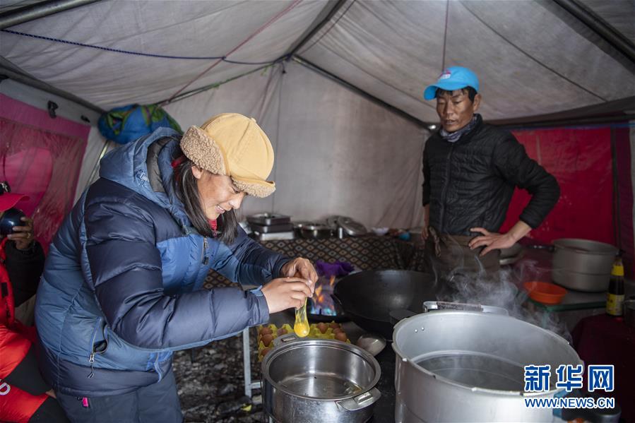 在海拔6500米的前進(jìn)營地,高山廚師在準(zhǔn)備菜品(5月10日攝)。新華社記者孫非攝