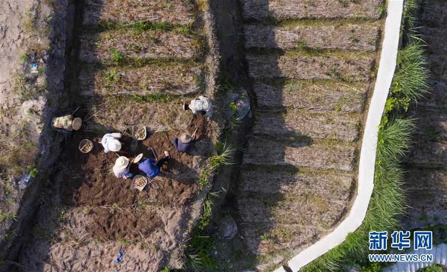 5月12日,青田縣巨浦鄉(xiāng)西坑村的村民在梯田收獲中藥貝母(無人機(jī)照片)。新華社記者徐昱攝