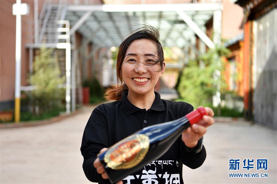 西藏芒康縣藏東珍寶酒業(yè)有限公司副總經(jīng)理曲措在展示一款“達(dá)美擁”葡萄酒(5月4日攝)。新華社記者詹彥攝