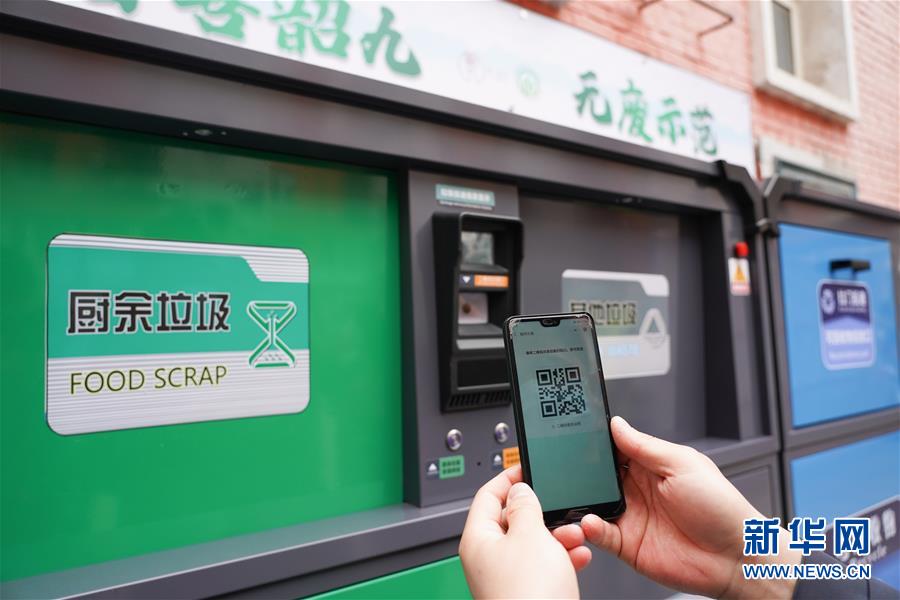 5月17日,在東華門(mén)街道韶九社區(qū),工作人員在展示用于垃圾分類(lèi)投放和積分的二維碼。新華社記者鞠煥宗攝