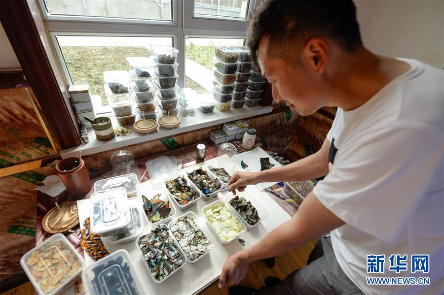 在吉木薩爾縣七彩蝶園,關(guān)富云在挑選制作蝶翅畫所需的蝴蝶翅膀(5月15日攝)。新華社記者丁磊攝