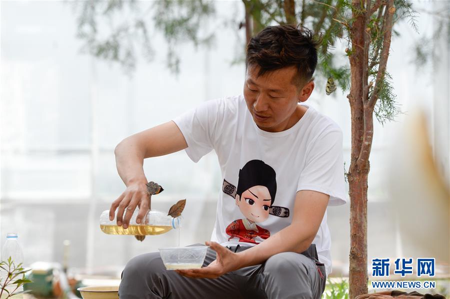 在吉木薩爾縣七彩蝶園,關(guān)富云在為蝴蝶制作飼料(5月15日攝)。新華社記者丁磊攝