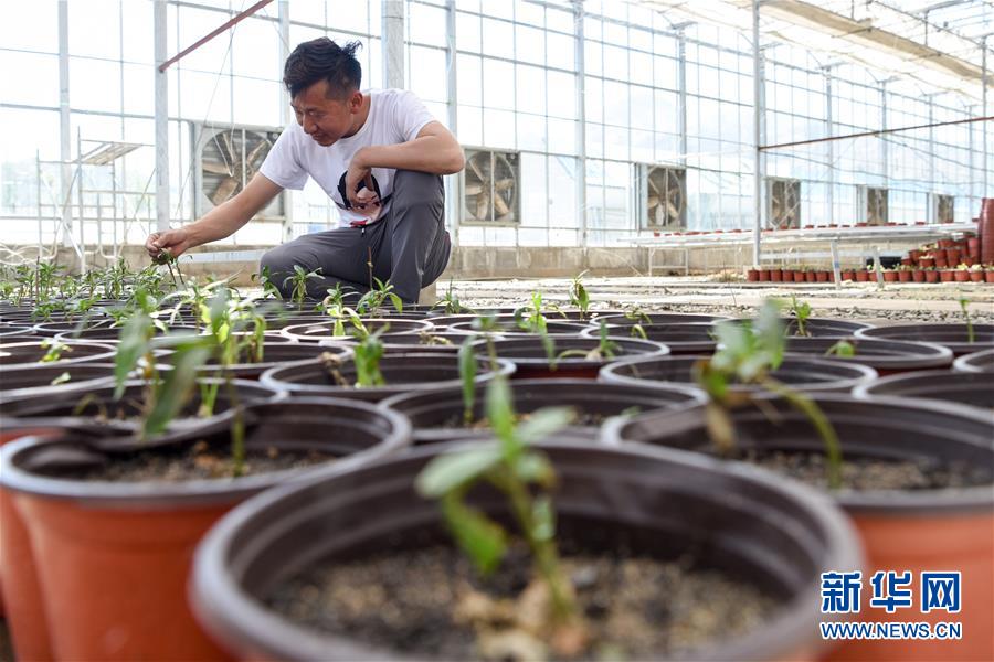在吉木薩爾縣七彩蝶園,關富云在查看蝴蝶幼蟲的寄主植物生長情況(5月15日攝)。新華社記者丁磊攝