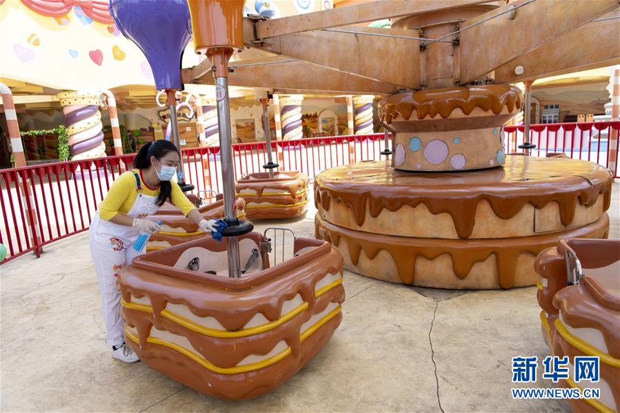 5月19日,工作人員對游樂設(shè)施進(jìn)行消毒。當(dāng)日,湖北武漢歡樂谷重新開放。園區(qū)執(zhí)行客流量管控,游客需通過網(wǎng)上預(yù)約才能進(jìn)入,室內(nèi)場館暫不開放。新華社記者熊琦攝