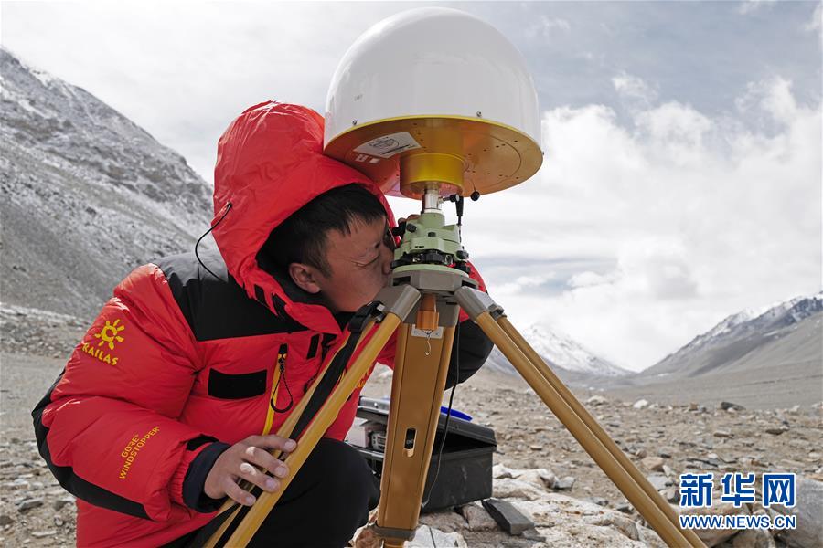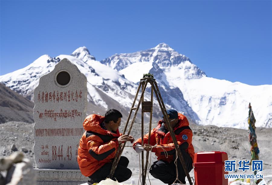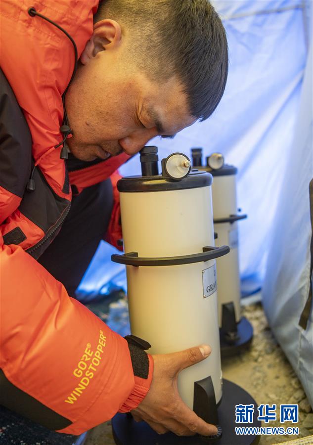 國測一大隊隊員在珠峰大本營測試地面測量中使用的重力儀(5月3日攝)。新華社記者晉美多吉攝