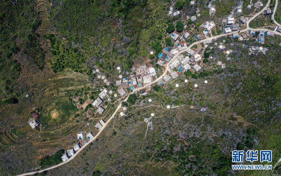 這是2019年底通車的大化瑤族自治縣七百弄鄉(xiāng)弄平村的進(jìn)村路和水柜(5月14日攝,無人機(jī)照片)。新華社記者曹祎銘攝