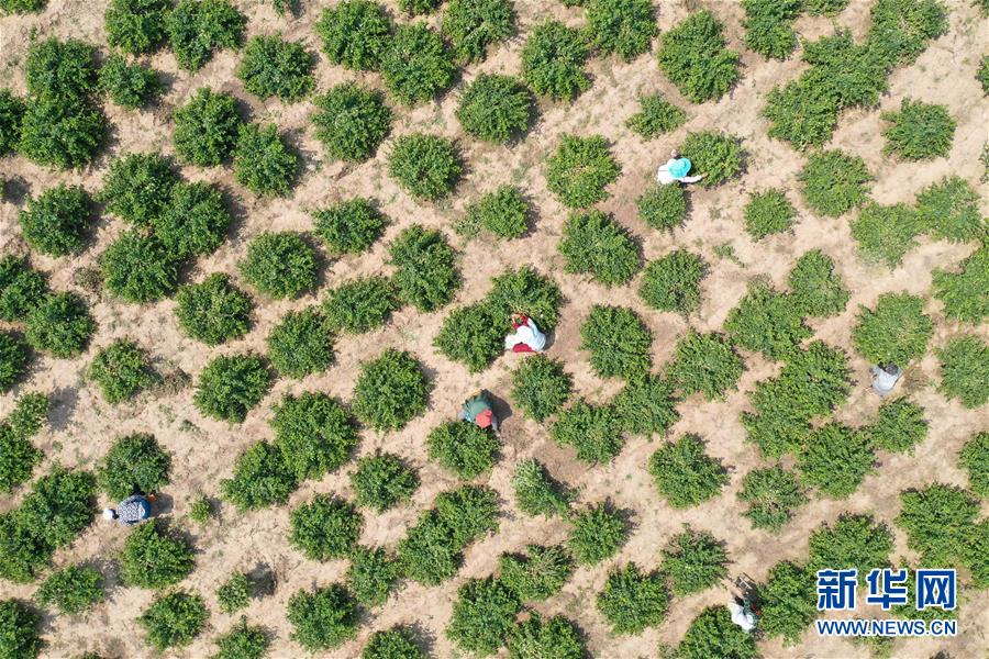 5月21日,河北省清河縣農(nóng)墾金銀花種植專業(yè)合作社社員在采收金銀花(無人機(jī)照片)。2017年以來,河北省清河縣在推進(jìn)農(nóng)業(yè)產(chǎn)業(yè)結(jié)構(gòu)調(diào)整過程中,結(jié)合市場(chǎng)需求,立足當(dāng)?shù)赝寥馈夂蛱攸c(diǎn),依托公司“訂單”引導(dǎo)農(nóng)民發(fā)展金銀花種植。目前,清河縣金銀花種植面積近2000畝,帶動(dòng)40多個(gè)村莊的2000余名農(nóng)民人均增收千元以上。新華社記者牟宇攝