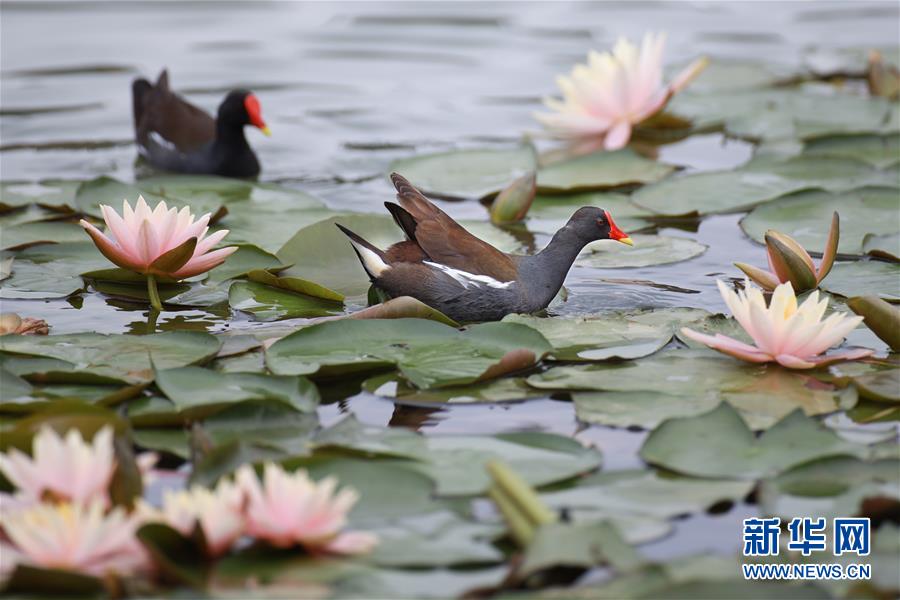5月22日,兩只紅嘴水雞在蓮葉間覓食。近日,貴陽市觀山湖公園內(nèi)大片盛開的蓮花吸引了不少水鳥在其間嬉戲覓食。新華社記者劉續(xù)攝