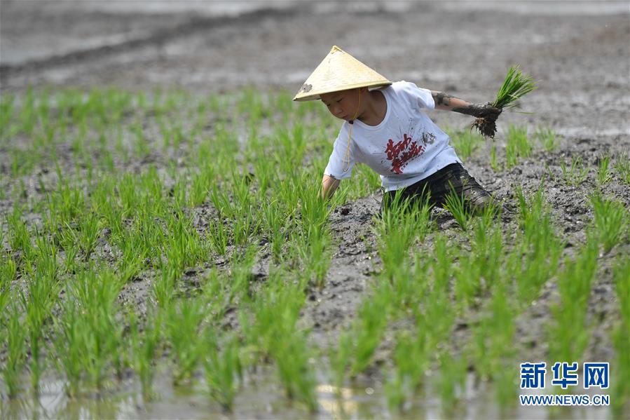 5月24日,一名小朋友在稻田里插秧。當(dāng)日,十余名小朋友在家長的帶領(lǐng)下來到浙江省湖州市吳興區(qū)八里店鎮(zhèn)尹家圩糧油植保農(nóng)機(jī)專業(yè)合作社的稻田中,參加親子插秧、稻田捉魚等農(nóng)事體驗(yàn)活動。新華社記者黃宗治攝