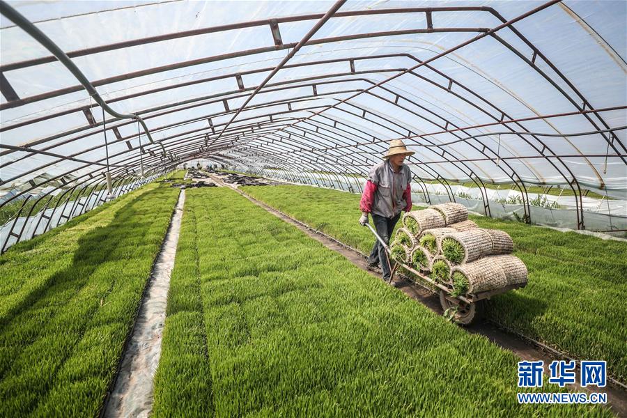 5月24日,盤錦市大洼區(qū)的農(nóng)民在育苗棚內(nèi)搬運符合插秧標(biāo)準(zhǔn)的水稻秧苗。新華社記者潘昱龍攝
