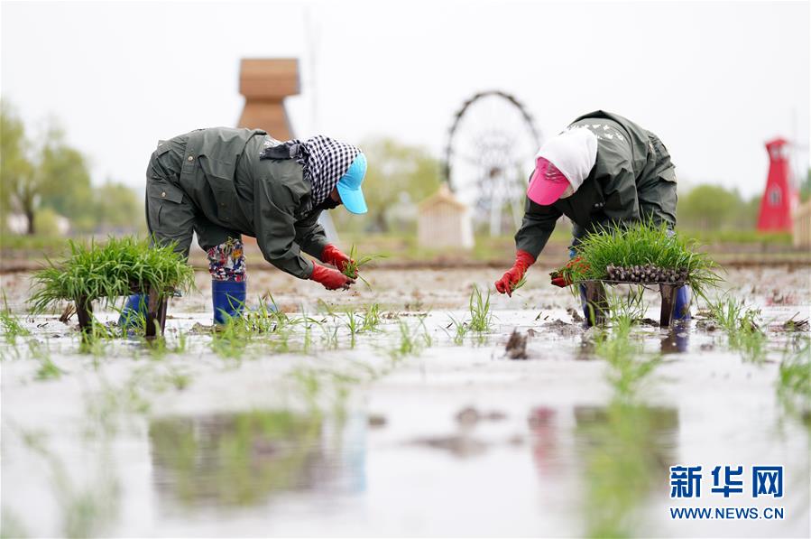 5月22日,在寧安市渤海鎮(zhèn)上官地村一塊稻田中,農(nóng)民在進(jìn)行插秧。新華社記者王建威攝