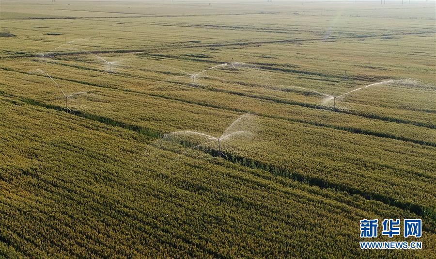 5月26日,內(nèi)丘縣中程村麥田的噴灌設(shè)備在澆灌小麥(無(wú)人機(jī)照片)。夏日時(shí)節(jié),河北省邢臺(tái)市內(nèi)丘縣農(nóng)民搶抓農(nóng)時(shí)開(kāi)展麥田后期管理,為小麥增產(chǎn)豐收打好基礎(chǔ)。新華社記者朱旭東攝