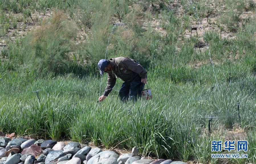 5月28日,工人在巴丹吉林鎮(zhèn)生態(tài)修復(fù)項(xiàng)目南部河道附近修理噴灌設(shè)備,以節(jié)約用水。2017年以來,內(nèi)蒙古阿拉善右旗在巴丹吉林鎮(zhèn)開展生態(tài)修復(fù)項(xiàng)目,種植適合在當(dāng)?shù)厣L的馬蓮、紅柳等植物,修復(fù)生態(tài)的同時(shí)也起到美化作用。巴丹吉林鎮(zhèn)是巴丹吉林沙漠旅游景區(qū)的游客集散地,這里常年干旱少雨,水資源匱乏。新華社記者徐欽攝