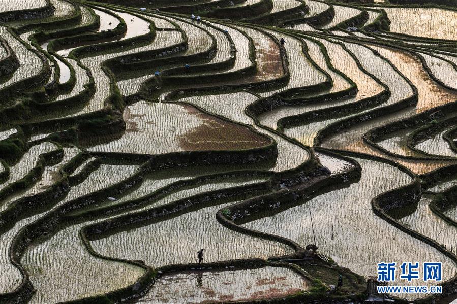 晨光中的從江縣加榜鄉(xiāng)加車梯田(5月28日攝)。夏日時(shí)節(jié),位于貴州省黔東南苗族侗族自治州從江縣加榜鄉(xiāng)加車、加頁(yè)、黨扭等苗寨的梯田在晨霧與陽(yáng)光的映襯下線條分明,光影變幻,景色如畫。新華社記者 楊文斌 攝