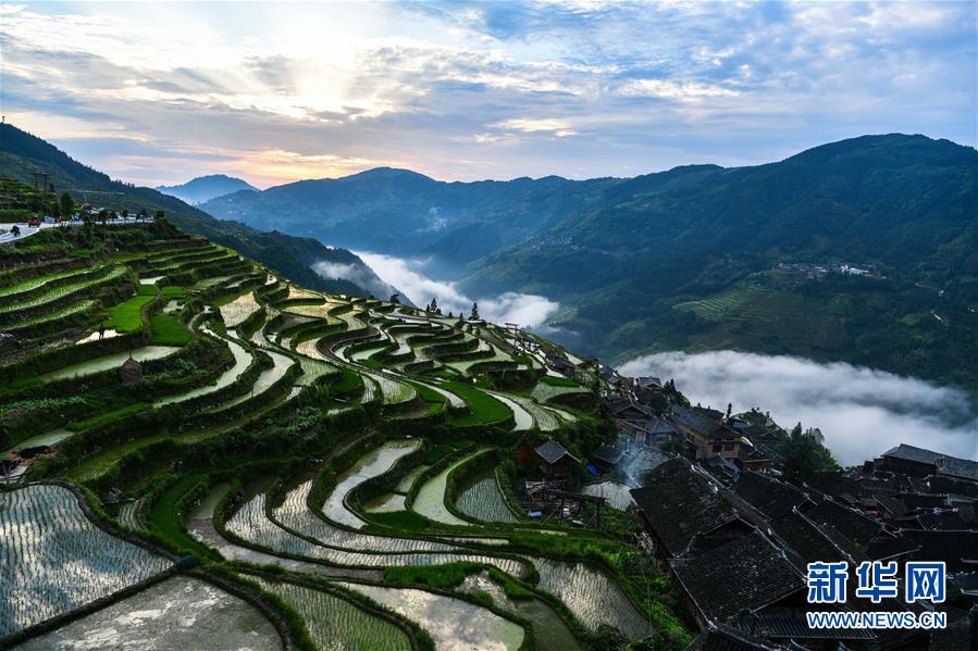 晨光中的從江縣加榜鄉(xiāng)加車梯田(5月27日攝)。夏日時(shí)節(jié),位于貴州省黔東南苗族侗族自治州從江縣加榜鄉(xiāng)加車、加頁(yè)、黨扭等苗寨的梯田在晨霧與陽(yáng)光的映襯下線條分明,光影變幻,景色如畫。新華社記者 楊文斌 攝
